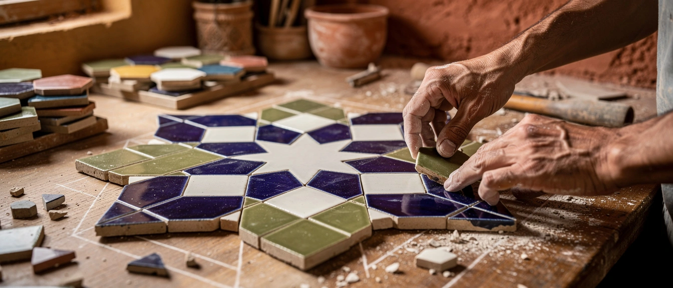 La fabrication du zellige suit un processus immuable. Le carreau émaillé, carré à l’origine, est retourné face émaillée contre le sol. L’artisan trace au dos le contour de la forme souhaitée (étoile, losange, chevron), puis taille avec précision en frappant le tranchant. Les tesselles obtenues sont ensuite assemblées face contre terre selon un patron préalablement dessiné. Une fois le motif complet, l’ensemble est figé dans du mortier, puis retourné pour révéler la surface émaillée.